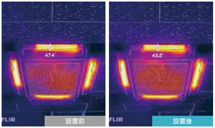 設置後、室内機の熱交換効率が向上したため、吹き出し温度が 47.4℃から 49.2℃まで上昇しました。