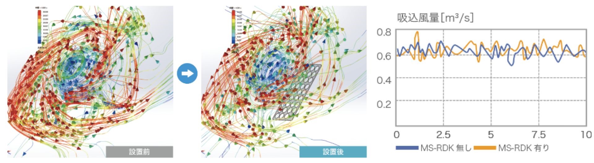MS-RDKの円形孔は、吸込気流の風量を落とすことなく乱流化させて熱交換直前のファン内での気流滞留を防ぎ、スムーズに気流を熱交換器に送ります。(名古屋市工業研究所における気流解析シュミレーションより)