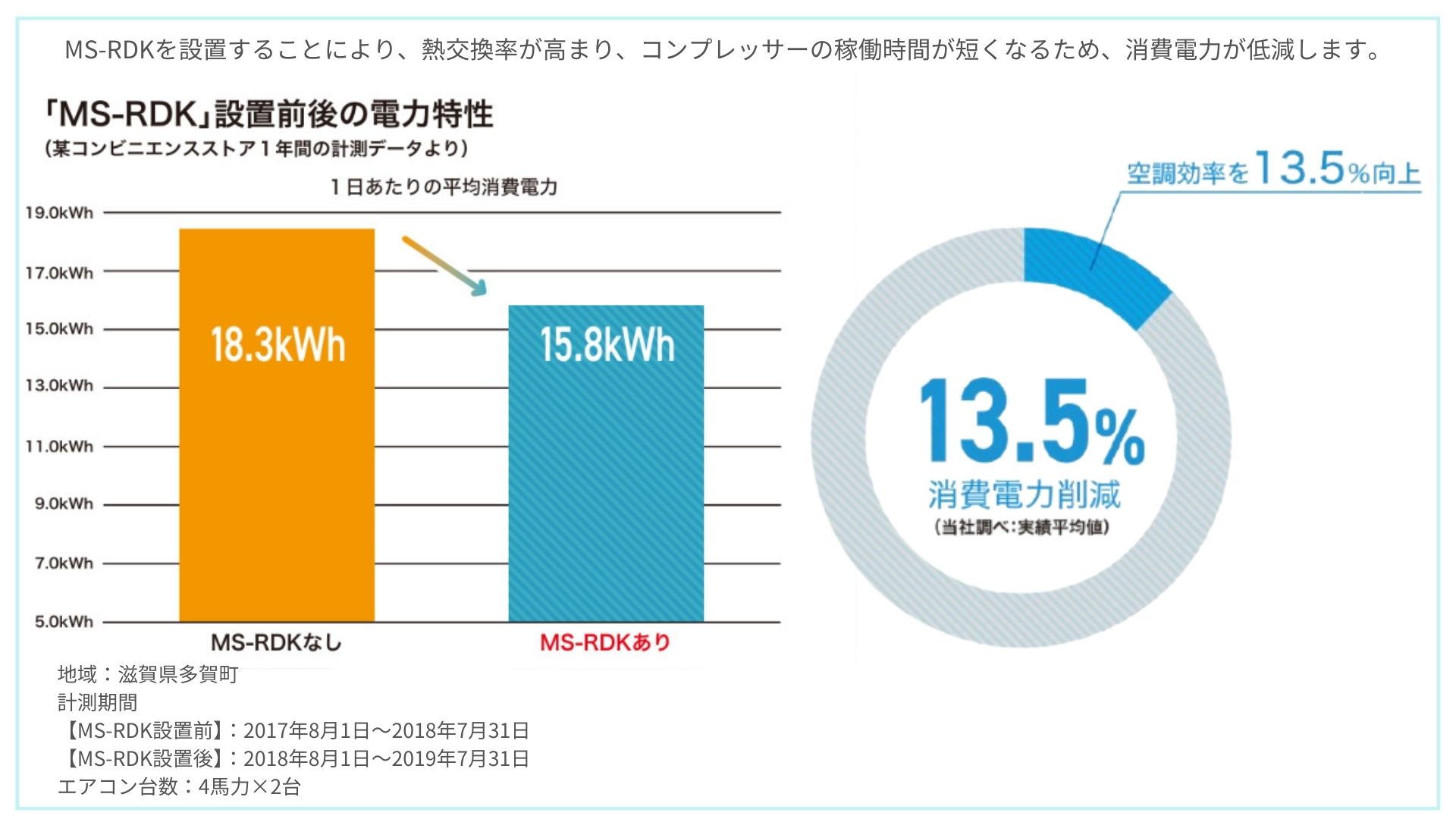 エアコンメーカー「LG電⼦」における性能評価試験(ISO規格)MS-RDKを設置した場合、消費電⼒1kwあたりの(吸込−吹出)熱量差が0.47℃多く、効率が13.1%向上していることが分かりました。
