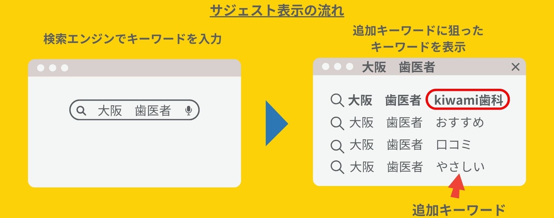 GoogleやYahoo!などで検索するときに、検索窓にキーワード入力をすると、いくつかの検索候補が表示されます。