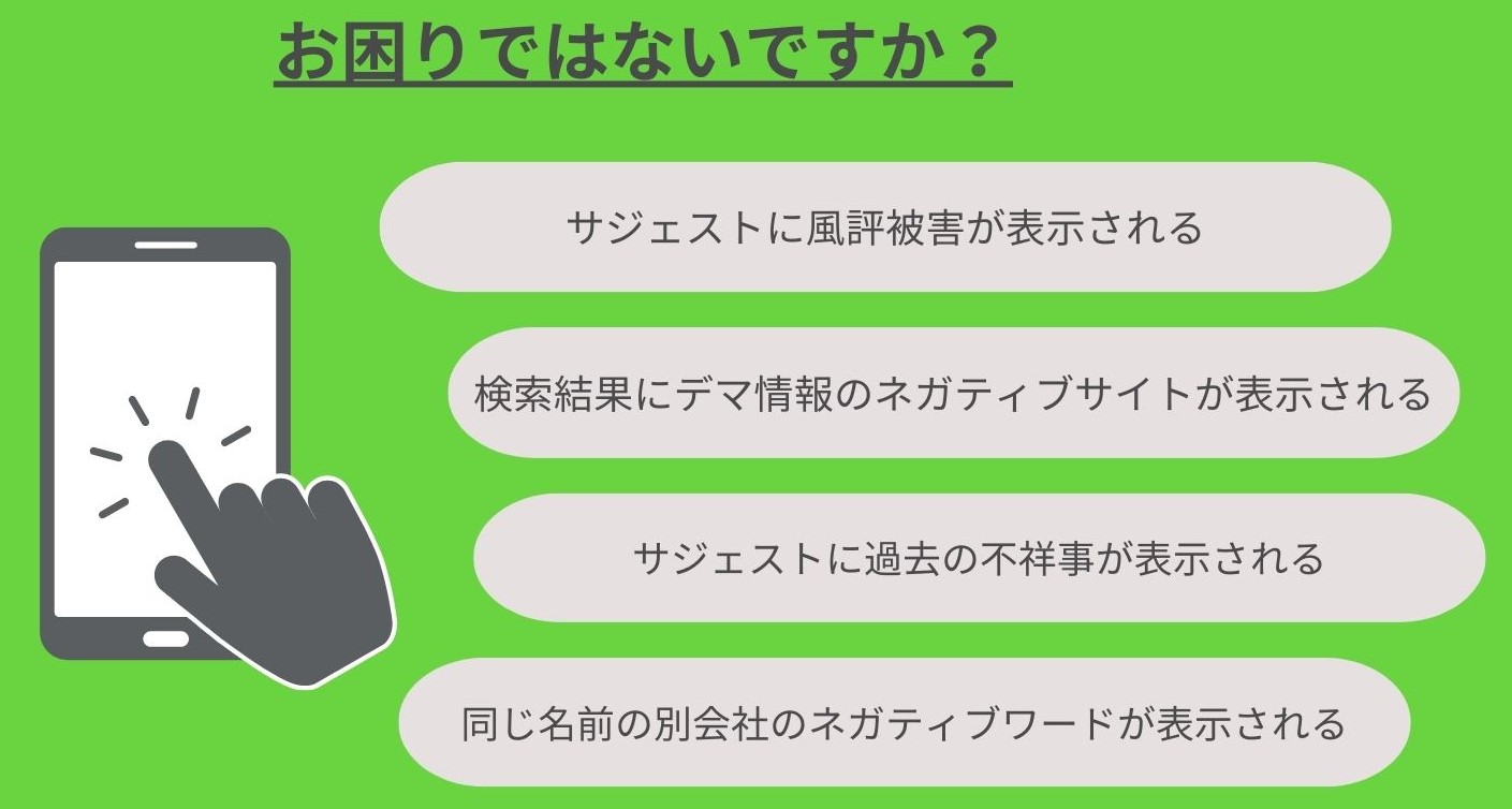サジェスト汚染対策とは、サジェストの検索候補が風評被害を連想させるネガティブキーワードで汚染されている状態から、ネガティブキーワードを消去することをいいます。