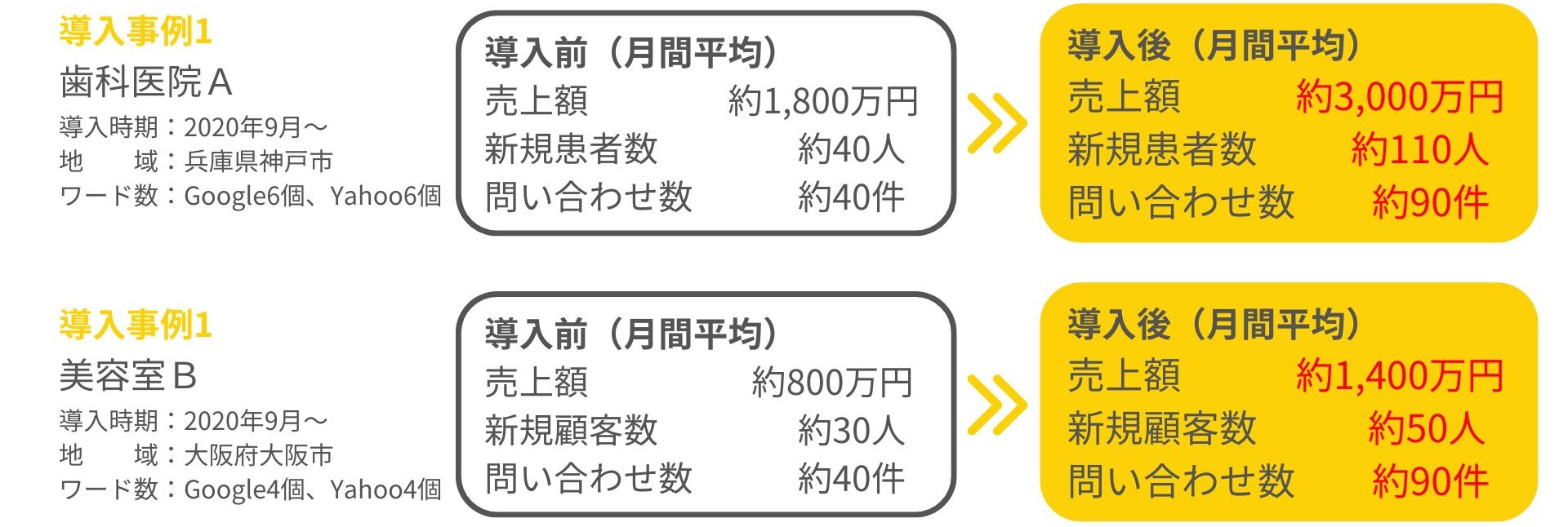 導入実績 約1040社、その多くで導入前と比較してページアクセスが向上し、様々な業種で集客に結果が出ています。